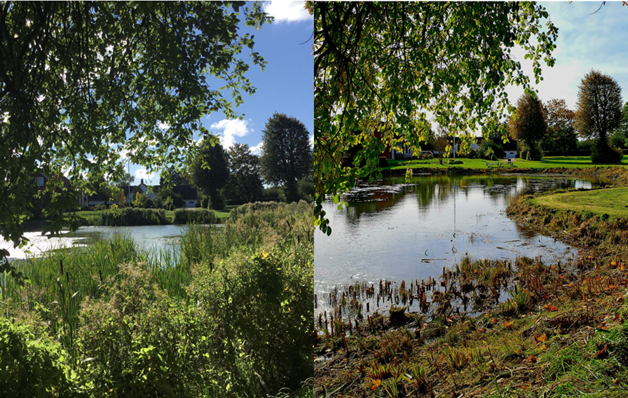Gadekær skal vedligeholdes år efter år. Mange steder er det lokale bylaug, der på frivillig basis står for det. Nogle steder er det en ganske stor opgave - som i Sneslev. Billedet af byens store gadekær viser før og efter d. 6. oktober, hvor beboerne samledes om at rydde gadekæret. Ud over siv og dunhammere blev der også fjernet vandakse, som er ved at blive et problem. "- En dejlig dag med fantastisk samarbejde, dejligt vejr, godt humør og god appetit."